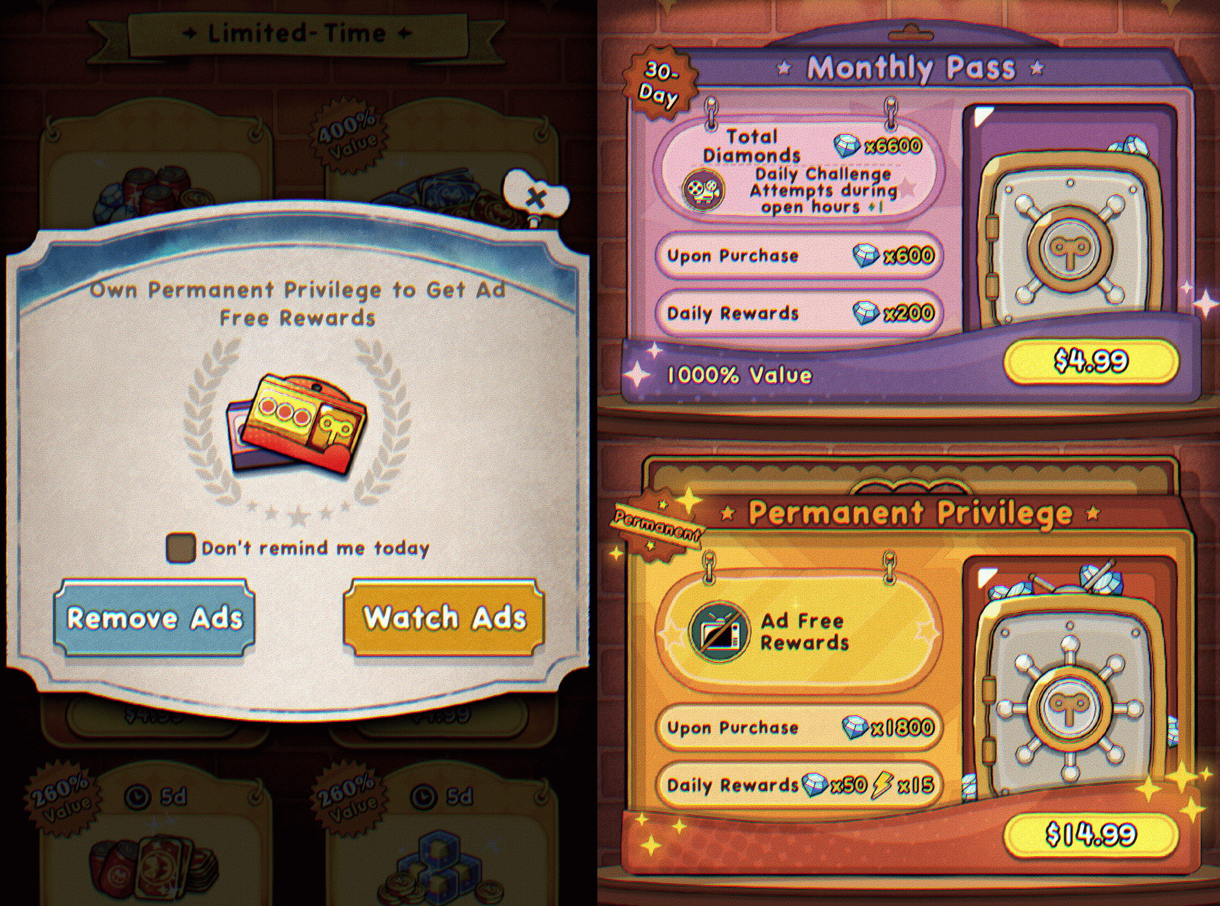 What I find interesting is not only the recurring pop-up itself, which constantly reminds the player about the option to turn off ads, but also the way the offers are structured. It’s not really about “buying ad removal”, but rather attractive hard currency bundles, with ad removal thrown in as a freebie.